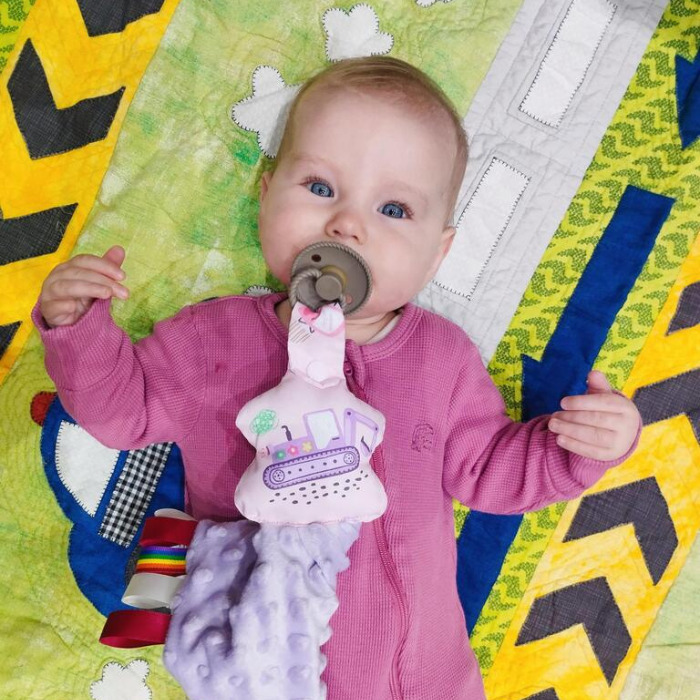 We love this! Easy for baby to manage, and baby loves the different textures and snuggly parts. Very handy to be able to clip on to straps and things to stop Dummy being lost or dropped! Might have to order a spare!